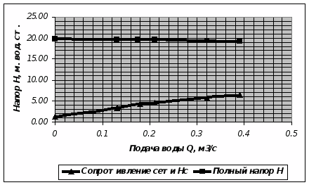 Вывод: осуществлено практическое знакомство с насосной установкой и проведены испытания с необходимыми замерами. Построена характеристика сети (Н-Q); наложение графиков H=b(Q) и Hc=b(Q) показало, что в процессе эксперимента рабочая точка насоса не была получена.