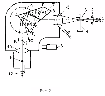 Оптическая схема монохроматора показана на рис. 2. Здесь: 1 - исследуемый источник света; 2 - конденсорная линза, предназначенная для увеличения яркости освещения щели. Ширина входной щели 3 регулируется микрометрическим винтом 4. Объектив 5 формирует параллельный пучок света и направляет его на переднюю грань призмы. Точная настройка (подвижка) этого объектива производится при помощи микрометрического винта 6. Призма Аббе 7 установлена на столике 9, который приводится во вращение барабаном 8. При помощи объектива 10 зрительной трубы изображение входной щели монохроматора формируется вблизи фокальной плоскости окуляра 12. В этой же плоскости помещен визир 11 – острие иглы. Это позволяет при визуальном наблюдении через окуляр одновременно видеть резкие изображения входной щели (вертикальные полоски света) и визира. Когда столик 9, на котором укреплена призма 7, барабаном 8 поворачивается относительно вертикальной оси, спектр также поворачивается, перемещаясь горизонтально, и в поле зрения