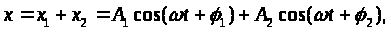 Циклічні частоти ω в обох випадках однакові. Зміщення x від положення рівноваги, при участі тіла одночасно в двох коливаннях, виражається алгебраїчною сумою
