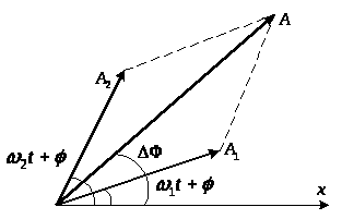 Розглянемо додавання двох коливань однакового напрямку з однаковими періодами, які відбуваються з деякою різницею фаз і мають різні амплітуди. Нехай ці коливання відбуваються в напрямі осі x. Запишемо рівняння цих коливань