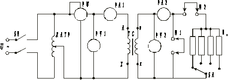 4. Для дослідження роботи трансформатора під навантаженням необхідно зняти перемичку П1 і поставити перемичку П2. Встановити режим холостого ходу. Покази приладів занести в табл.3. Після, змінюючи за допомогою перемикача SA опір навантаження, виміряти напруги, струм і потужність для умов, вказаних в табл.3. При проведенні дослідів необхідно підтримувати напругу на первинній обмотці рівною номінальній, змінюючи коефіцієнт трансформації автотрансформатора.