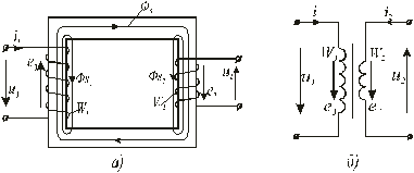 Будова однофазного двообмоточного трансформатора показана на рис.13.2,а, а умовне позначення - на рис 13.2,б.
