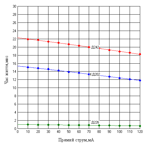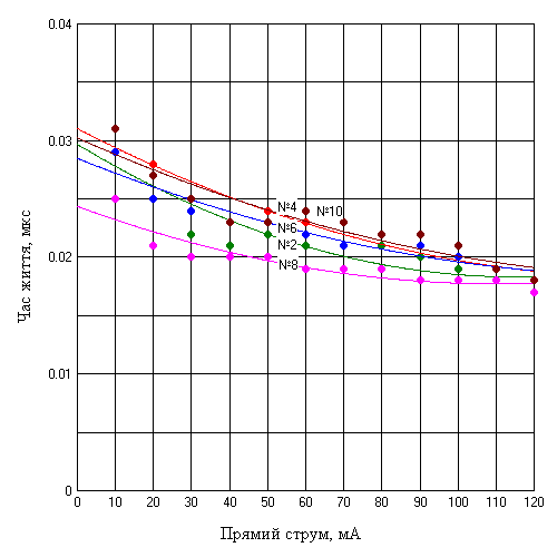 Рисунок 5.12 – Залежність часу життя від прямого струму для епітаксіальних p-i-n діодів КД524