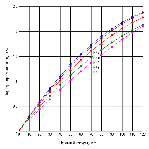 Досліджувались особливості залежності заряду перемикання від прямого струму для епітаксіальних та дифузійних p-i-n структур різних типів та розмірів.