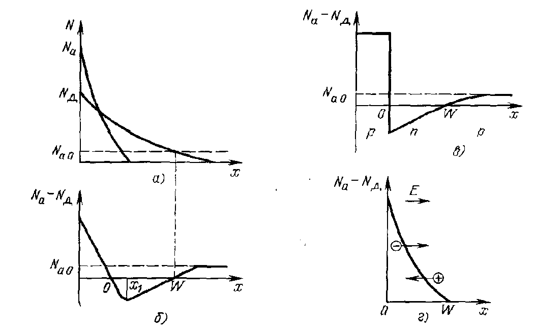 Теперь видны три области в полупроводнике: р-типа (x<0, N>a>-N>d>>0), п-типа (W>x>0, N>a>-N>d><0), р-типа (x>W, N>a>-N>d>>0). Первая область может использоваться в качестве эмиттера транзистора, вторая — в качестве базы, третья — коллектора. Обычно режим диффузии выбирается так, что N>aэ>>>> >N>dб,ср>>> N>aк> (N>dб,ср> — средняя концентрация примесей в базе). Поэтому приближенно распределение примесей можно изобразить в виде рис. 1.2,в.