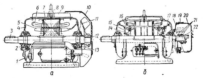 а — з короткозамкненим ротором; б — з фазним ротором; 1 — підшипниковий щит; 2, 13 — підшипники; 3 — вал; 4 — вікно для перевірки щупом зазору між сталлю статора і ротора; 5 — вентиляційна лопать на роторі; 6.— обмотка статора; 7 — осердя статора; 8 — підйомне кільце (рим); 9 — ребро станини; 10 — захисний кожух; 11 — вентилятор; 12 — отвори для всмоктування повітря вентилятором; 14 — тримач обмотки; 15 — диск кріплення балансувального вантажу; 16 — обмотка фазного ротора; 17 — вивід кінців роторної обмотки до контактних кілець; 18 — чашка; 19 — замок; 20 — ковпак; 21 — контактні кільця; 22 — втулка, що ізолює контактні кільця від вала.