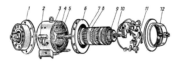 1—задній підшипниковий щит; 2 — затискачі; 3—станина; 4 - головний полюс;5 — обмотка головного полюса; 6—вентилятор; 7 — обмотка якоря;8 — осердя якоря; 9 - колектор; 10 — вал; 11 — траверса із щитковим механізмом; 12 — передній підшипниковий щит