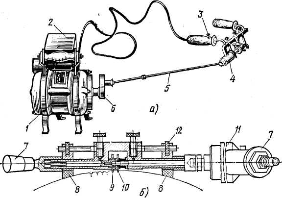 Рис. 11. Переносні пристрої для продорожуванія колекторів з приводом від електродвигуна (а) і з пневматичним приводом (б)