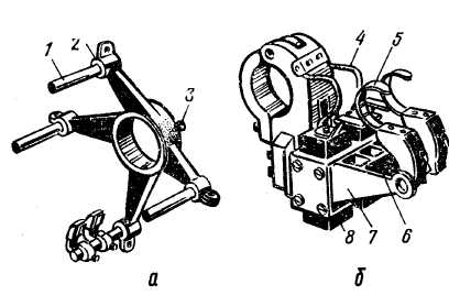 а - траверса; б — щіткотримач; 1 — щітковий палець; 2 — ізоляція кільця від траверси: 3 - стопорний болт; 4 — мідний провід; 5 — натискні пластини; 6 — місце розміщення пружини; 7 – обойма; 8 – щітка;