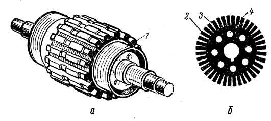 а — якір без обмотки; б —сталевий лист осердя якоря; 1 — натискні шайби; 2 —зубець; 3 — паз; 4 — вентиляційний отвір
