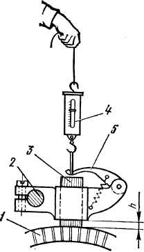 Натиснення на щітку 3 (Рис. 8), пружиною, вимірюють динамометром 4, закріпленим за важіль 5 в тому місці, де він тисне на щітку. Між щіткою і колектором 1 прокладають лист паперу. Плавно натягуючи динамометр за гачок, помічають його свідчення в мить, коли папір може бути без зусилля витягнутий. Воно відповідатиме натисненню щітки на колектор, яке повинне бути витримано в межах, що рекомендуються для даної машини.