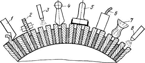 1 - обточування, 2 - продорожуваніє, 3,8 - продування стислим повітрям, 4 - зняття фасок, 5 - шліфовка і поліровка, 6 - притирання щіток, 7 - чищення дрантям