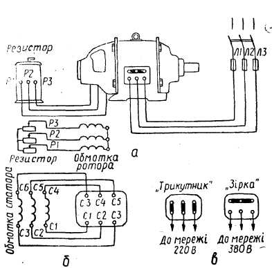 Рис.2. Схема з'єднування обмоток асинхронного електродвигуна. а — до живильної мережі; б — ротора; в — на дошці затискачів
