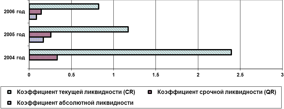 Отрицательная тенденция изменения этого показателя за анализируемый период уменьшила вероятность погашения текущих обязательств за счет производственных запасов, готовой продукции, денежных средств, дебиторской задолженности и прочих оборотных активов.