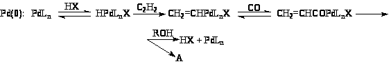 В первом случае вначале активируется спирт (S>E>), а затем СО и С>2>Н>2>, во втором – реакция начинается с окислительного присоединения HX, затем в реакцию вступают ацетилен, СО и ROH. Таким образом, выбор возможных стадий и схем механизма прежде всего определяется свойствами металлокомплекса в растворе или свойствами активного центра на поверхности.