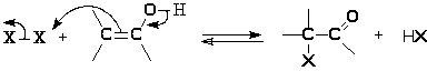 В присутствии оснований сначала медленно образуются еноляты или енолы, которые далее быстро реагируют с галогенами: