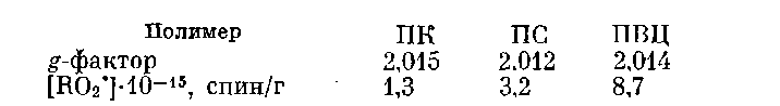 Действие озона на ПЭ и другие полимеры сопровождается образованием перекисных радикалов [7, 20, 48]. При исследовании [29] процессов образования радикалов в реакции с озоном 0,15–0,3 г порошка полимера вносили в ампулу (d~6 мм), помещенную в резонатор ЭПР-спектрометра. и через капилляр подавали озоно-кислородную смесь, содержащую 2,2-•10–3 моль/л 0>3>. Через 2–3 мин после начала подачи озона возникали парамагнитные частицы, концентрация которых в дальнейшем либо оставалась постоянной, либо изменялась. Результаты этого исследования приведены ниже.