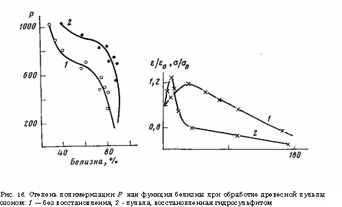 При действии озона в процессе отбеливания древесной пульпы иногда наблюдается увеличение прочности бумаги, приготовленной из этой пульпы. Эффект увеличения прочности отмечен также при действии озона на углеродные волокна и волокна иной природы. На рис. 17 приведены зависимости прочности на разрыв и максимального удлинения от времени обработки озоном [11]. Несмотря на то что эти наблюдения были сделаны относительно давно, природа указанного эффекта, его предельные величины и возможности технического использования до сих пор остались не выясненными.