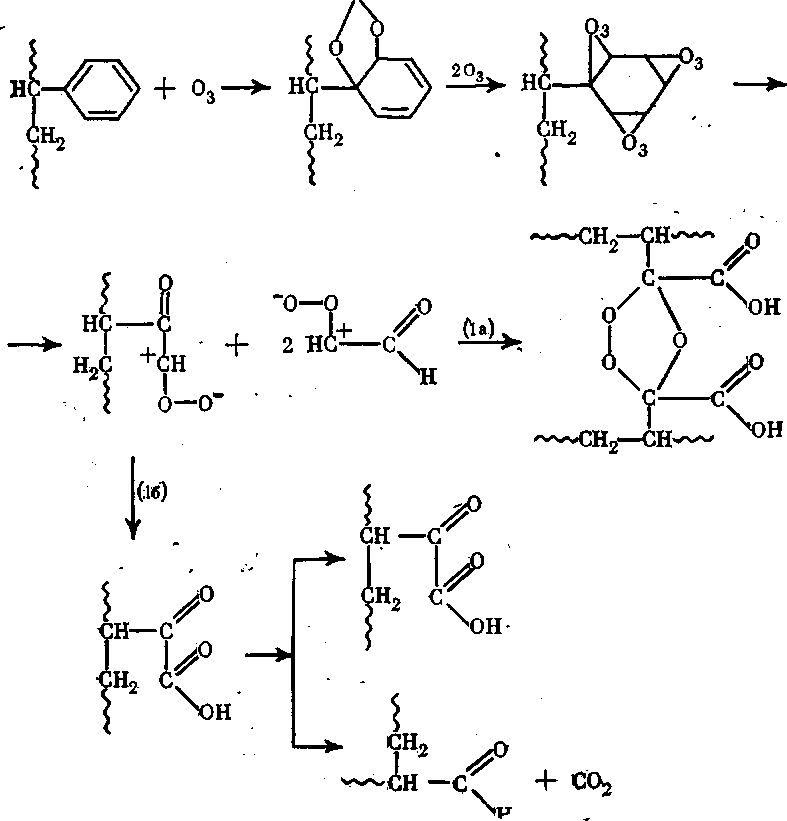 Присоединение первой молекулы озона к ароматическому циклу нарушает сопряжение и значительно облегчает присоединение двух следующих молекул. Первичные озониды нестабильны и легко распадаются на фрагменты, которые быстро соединяются вновь, изменив на 180° пространственную ориентацию (реакция (1а)), либо изомеризуются (реакция (16)). На схеме реакция (1а) приведена условно, демонстрируется та ее часть, которая приводит к появлению сшивок.
