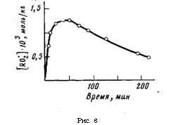 Рис. 6. Характер изменения концентрации R0>2>» при озонировании порошка ПС ([Оз]=1,74–10-4 моль/кг, поверхность образца 6 м2/г)