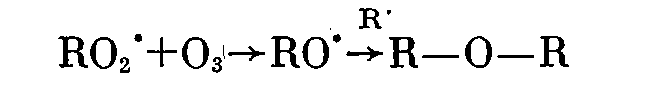 В зависимости от концентрации реагентов, подвижности полимерной матрицы, условий опыта и от природы ближайших соседей механизм превращения перекисных радикалов в продукты реакции может быть различным. При небольших концентрациях озона в растворах преобладают процессы распада макромолекулярных перекисных радикалов, поскольку малая подвижность полимерных цепей препятствует бимолекулярному взаимодействию макрорадикалов. Гибель свободной валентности происходит при встречах вторичных низкомолекулярных радикалов друг с другом и с макромолекулами.