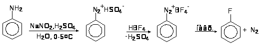 Для замещения диазогруппы на фтор к раствору соли бензолдиазония прибавляют тетрафторборную кислоту, при этом осаждается тетрафторборат бензолдиазония, который отфильтровывают, промывают и сушат. При осторожном нагревании тетрафторборат бензолдиазония разлагается с образованием фторбензола: