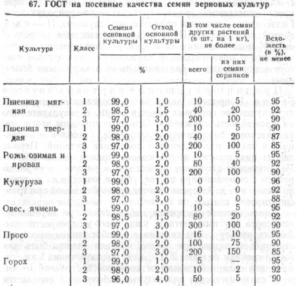 К посевным качествам, нормируемым ГОСТом, относятся: чистота, всхожесть, наличие семян других растений, в том числе сорняков, наличие голых (обрушенных) зерен у пленчатых культур (кроме ячменя). По посевным качествам семена зерновых культур делятся на три класса (табл).