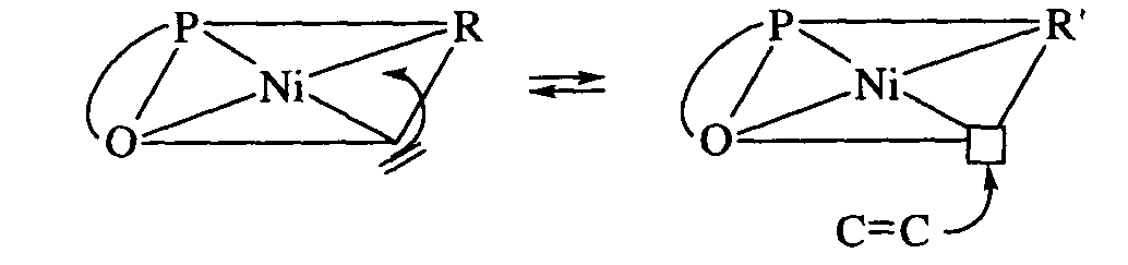 Механизм, приведенный на схеме I, подтверждается спектроскопическими исследованиями, проведенными in situ. Так, ЯМР исследования, выполненные в этих условиях, показывают, что в растворе присутствует гидрид никеля 3, который был зафиксирован при использовании Ph>2>PCH>2>C(CF>3>)>2>OH в качестве лиганда [2]. Оказалось, что можно выделить этильный 4 и бутильный 5 комплексы никеля, а также комплексы Ni, содержащие высшие алкильные группы, которые являются продуктами многократного внедрения этилена. При нагревании эти комплексы отщепляют соответственно этилен, бутен-1 или высшие сс-олефины, возвращаясь тем самым к комплексу 3.