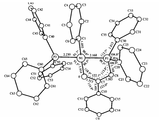 Рентгеноструктурный анализ подтвердил плоскоквадратную структуру комплекса. Реакция комплекса 14 с этиленом давала смесь линейных и разветвленных олефинов, что указывало на потерю хемоселективности образования линейных продуктов реакции. Очевидно, олефины, возникающие при олигомеризации этилена, вступают затем в реакцию соолигомеризации, что и приводит к появлению разветвленных продуктов.