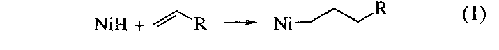 По нашим сведениям это единственный комплекс, который вызывает димеризацию а-олефинов, приводя к преимущественному образованию линейных продуктов. Для этого нужно, чтобы реакция присоединения катализатора Ni-H к а-олефину протекала против правила Марковникова (уравнение (1)).