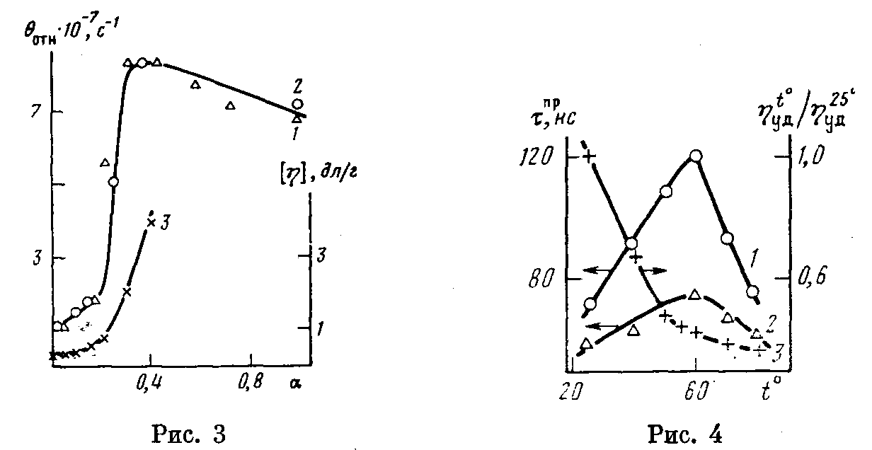 Рис. 3. Внутримолекулярная подвижность ПМАК в воде при разных степенях ионизации СООН-групп 0>О>тн=6а/6>а>=о (1, 2) и [ц] раствора полимера (3); 25°. ММ полимера 3,2-103 (1) или 1.5-104 (2)