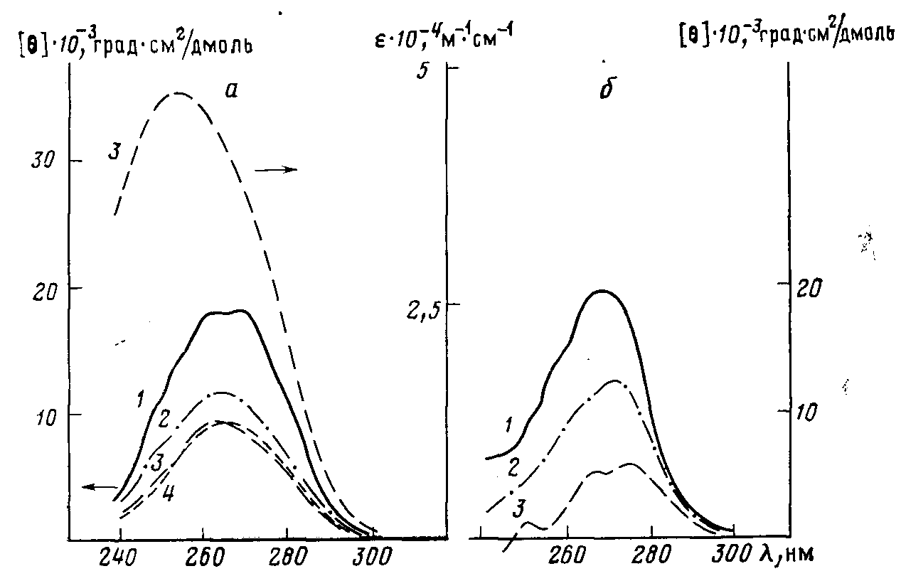 Рис. 3. Спектры поглощения и кругового ди- [в].рад.>см>г/д>МО>ль хроизма растворов полимеров VII (1), VIII-1, (2), VI1I-10 (3) и VIII-4 (4) в хлороформе (о) и диоксане (б)