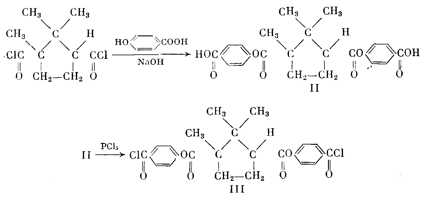 Поликонденсация камфороилхлорида с хлоргидрохиноном, гидрохиноном и 4,4'-диоксидифенилом также привела к получению полимеров V— VII, не обладающего ЖК-свойствами (табл. 1).