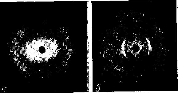 Ориентация доменов сохраняется в пленках, полученных из деформированного раствора испарением растворителя при комнатной температуре. Рентгенограмма рис. 7, а представляет картину ориентированной мезофазы: на экваторе расположены размытые дугообразные рефлексы при 20= =9°20' и слабо текстурированное кольцо при 20=2О°ЗО'. Кроме того, на меридиане имеются еще два дуговых рефлекса при 26=24с40' и 35°16'. При съемке параллельно направлению сдвиговой деформации («в торец») на рентгенограмме наблюдаются размытые кольца с очень слабым сгущением интенсивности на экваторе. Отсюда следует, что сдвиговая деформация ЖК-раствора ЦЭЦ в ДМФА приводит к возникновению аксиальной с-текстуры, когда оси макромолекул ориентированы преимущественно в направлении сдвига. Прогревание этой пленки при 450 К в течение 2 ч вызывает ее частичную кристаллизацию — на рентгенограмме имеются весьма четкие дугообразные рефлексы (рис. 7, б).