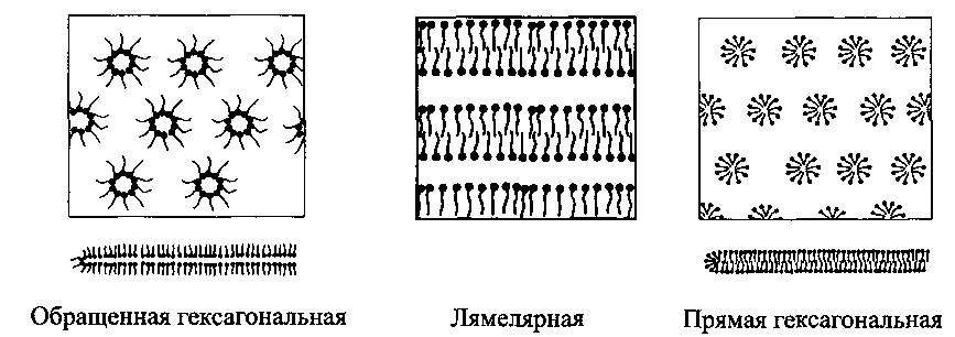 Например, гексагональная фаза построена из гексагонально упакованных цилиндров воды, окруженных полярными группами молекул ПАВ, а непрерывной средой является неполярная фаза. Обращенные кубические фазы и обращенные мицеллы аналогичным образом состоят из глобулярных ядер воды, окруженных молекулами ПАВ. Радиус таких микрокапель воды обычно составляет 20-100 А.