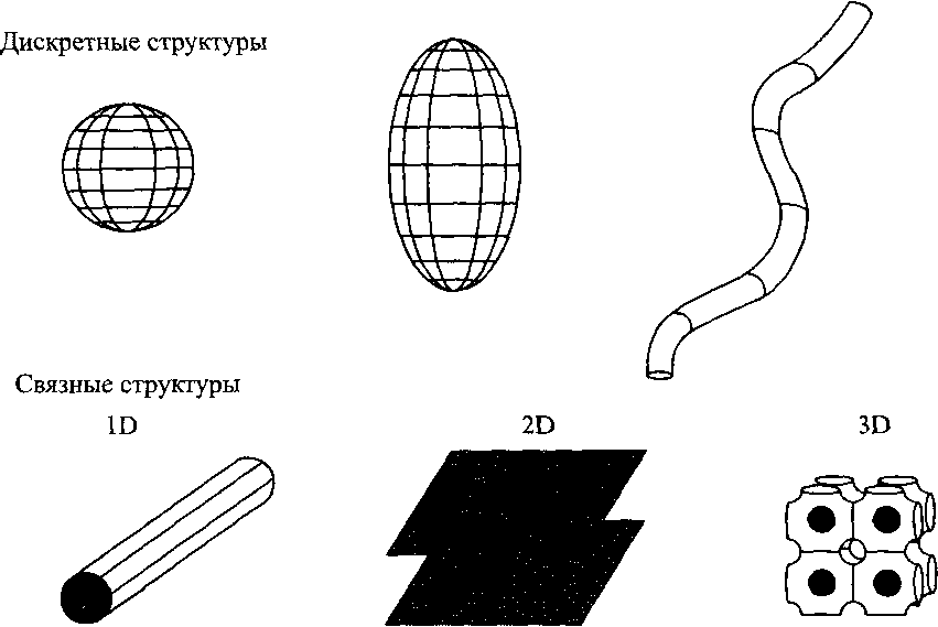 Мицеллы и бислои ПАВ служат "строительными блоками", из которых образуется большинство самоорганизованных структур. Рассмотрим подробнее их различия и приведем некоторые примеры. Как схематично показано на рис. все фазовые структуры ПАВ можно разделить на две группы: а) сформированные ограниченными ансамблями молекул ПАВ, которые можно грубо представить сферическими, вытянутыми, сплюснутыми или цилиндрическими частицами; б) образованные из неограниченных ансамблей молекул ПАВ. В последнем случае агрегаты молекул ПАВ связаны на макроскопических расстояниях в одном, двух или трех направлениях. Гексагональные фазы служат примером одномерной бесконечности, ламелярные фазы - двумерной, а трехмерные бесконечные структуры - это биконтинуальные кубические фазы, губчатые фазы и многие микроэмульсии.