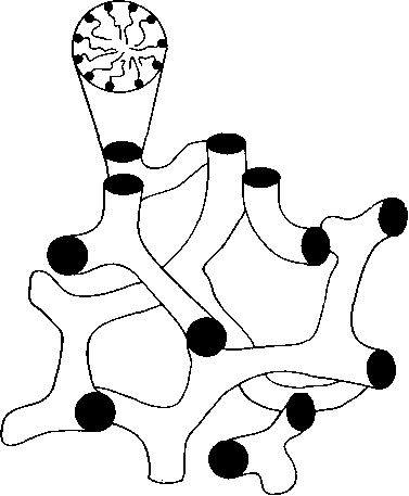 Таких структур может быть очень много. В них молекулы ПАВ образуют агрегаты, заполняющие пространство с формированием трехмерных пористых связных структур. Можно рассматривать такие структуры как образованные из связанных стержнеобразных мицелл, подобных разветвленным мицеллам, или из бислойных структур.