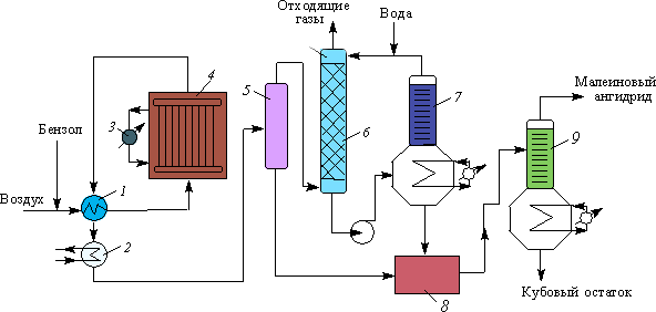 Контактные газы, выходящие из реактора 4, поступают в теплообменник 1, затем вхолодильник 2, в котором охлаждаются водой до 160–170 °С, после чего направляются в сепаратор 5, где из них выделяется часть малеинового ангидрида. Затем газы через сепаратор 5 поступают в скруббер 6, в котором улавливается водой оставшийся малеиновый ангидрид и другие растворимые в воде продукты реакции; малеиновый ангидрид при этом растворяется в воде, образуя малеиновую кислоту. Выходящий газ выбрасывается в атмосферу. Полученный 40%-й раствор малеиновой кислоты проходит стадию дегидратации в аппарате 7 и вместе с малеиновым ангидридом, выделенным из сепаратора 5, подвергается химической очистке и вакуумной ректификации в колонне 9. Выход малеинового ангидрида составляет 68–72 %.