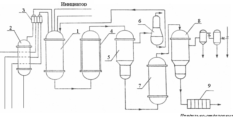 1- смеситель реагентов; 2 – выравниватель температур; 3 - дозирующая установка; 4 – реактор; 5 – демономеризатор; 6 – сепаратор-конденсатор; 7 – бак меланжирования; 8 – деаэратор; 9 – фильтр-пресс