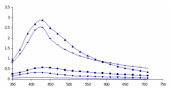 После синтеза гидрозоли серебра исследовались электронно-микроскопическим методом, а также визуально отмечалось изменение окраски растворов и/или образования осадка. Спектры поглощения Ag-гидрозоля регистрировали при комнатной температуре в области 300-700 нм на спектрофотометре Analiticjena (кювета (Q) – 1см).