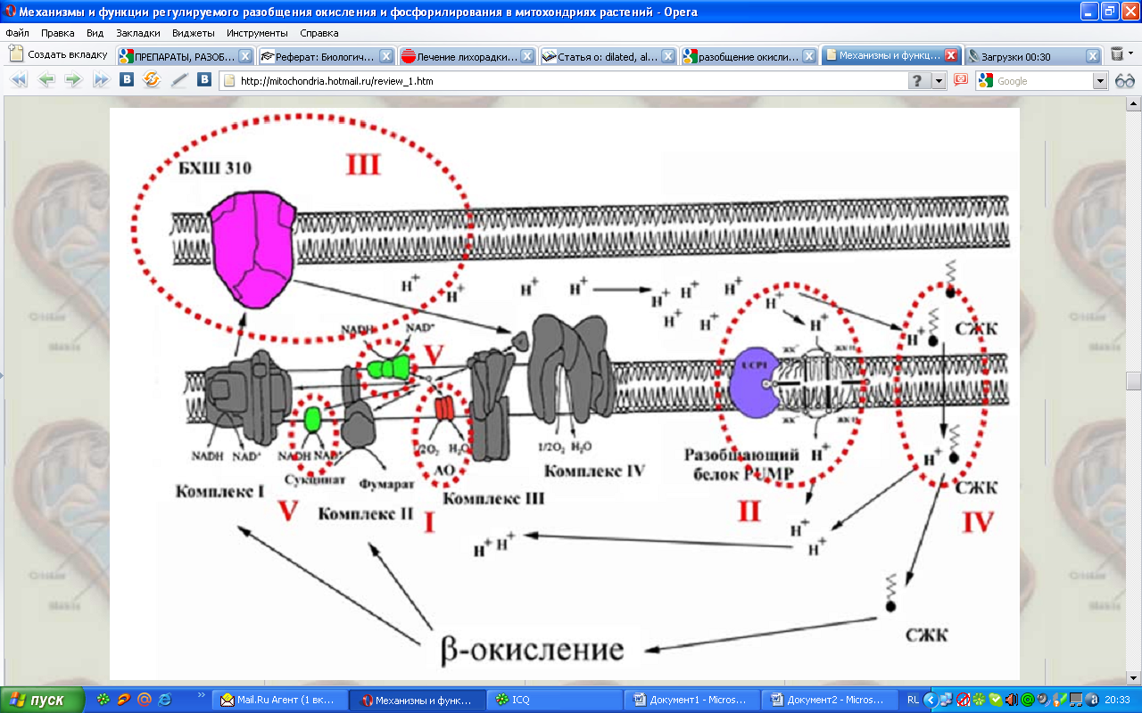Вещества, которые функционально разделяют между собой окисление и фосфорилирование, называются разобщающими агентами. Они содействуют переносу протонов из межмембранного пространства в матрикс без участия АТФ-синтазы. Разобщение может возникать, например, в результате механического повреждения внутренней мембраны или действия таких веществ, как 2,4-динитрофенол (2), являющихся переносчиками протонов через мембрану. Природным разобщающим агентом является термогенин, протонный канал в митохондриях бурых жировых клеток. Бурый жир обнаружен у новорожденных и животных, впадающих в зимнюю спячку и служит для теплообразования. При охлаждении организма норадреналин активирует гормонзависимую липазу. Благодаря интенсивному липолизу в организме образуется большое количество свободных жирных кислот, которые распадаются в результате β-окисления и в дыхательной цепи. Так как жирные кислоты одновременно открывают протонный канал термогенина, их распад не зависит от наличия АДФ, т.е. протекает с максимальной скоростью и генерирует энергию в форме тепла.