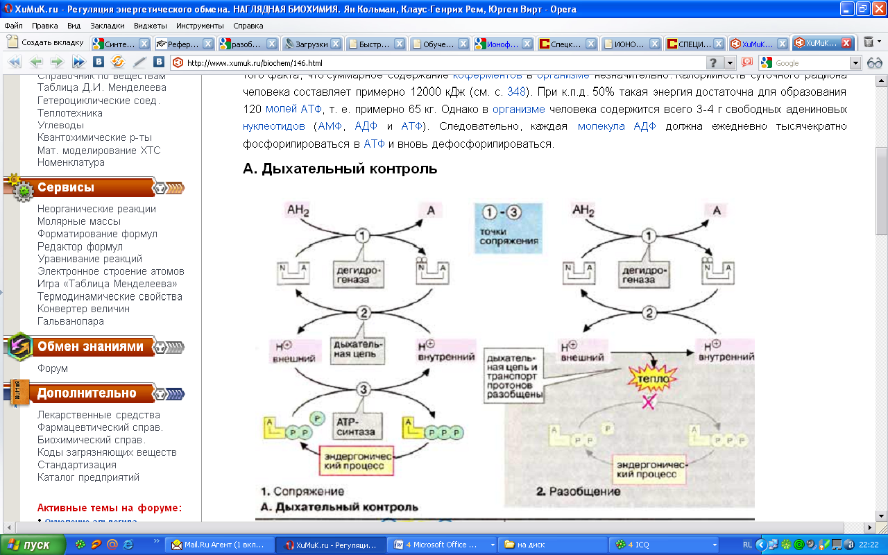 Антибиотик Олигомицин полностью блокирует окисление и фосфорилирование в интактных митохондриях. Однако, если вместе с олигомицином добавить разобщитель динитрофенол, то окисление пойдет, но без фофорилирования. Это означает, что олигомицин не действует непосредственно на ыхательную цепь, а подавляет стадию фосфорилирования. Разобщители переносят протоны через внутреннюю митохондриальную мембрану. Перенос от НАДФ к О2 в присутствии таких разобщителей протекает нормально, но образования АТФ митохондриальной АТФ-азой не происходит, поскольку исчезает протонодвижущая сила, обуславливающая перенос протонов через внутреннюю мембрану митохондрий. Потеря дыхательного контроля приводит к тому, что поглощение О2 и окисление НАДФ повышается. В то же время ДНФ не оказывает влияния на субстратное фосфорилирование. В силу своего специфического действия на дыхательную цепь ДНФ и другие разобщители служат ценным инструментом при исследованиях обмена веществ.