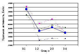 РИСУНОК 10 - Послойное распределение удельной активности радионуклида 137Cs после обработки почвы комплексам