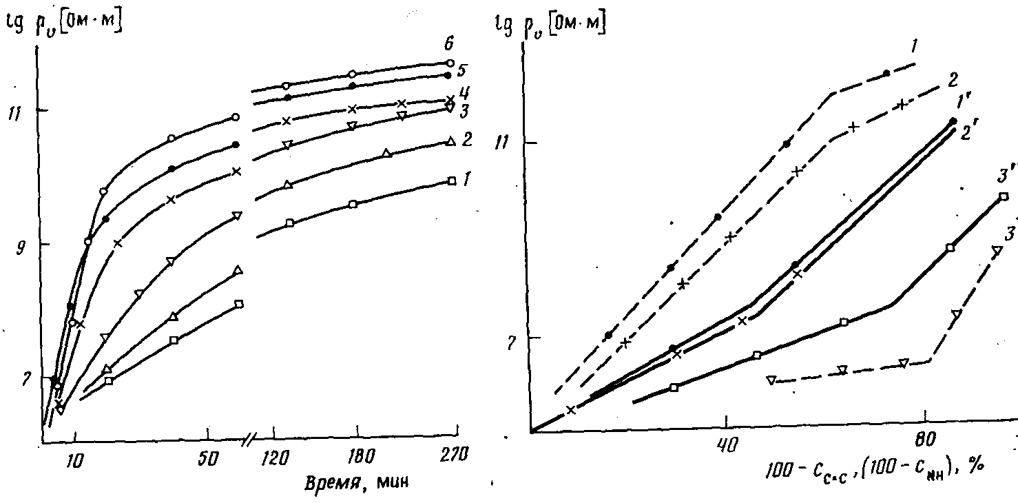 Полимеризацию ПБМИА осуществляли в специально изготовленной ячейке, представляющей собой двухэлектродную систему, разделенную фторопластовым изолятором, что позволяло сохранить постоянным расстояние между электродами в течение всего опыта. Около 0,5 г тщательно перемешанной смеси исходных компонентов I (Гпл = 157-158°)+П1 (7'>пл>=80о), либо II (Т>пл>= 198-200°) +IV (Г>пл>= = 187—189°), взятых в необходимом мольном соотношении, засыпали в измерительную ячейку. Для удаления воздуха смесь в ячейке слегка подпрессовывали и затем помещали в нагревательную систему, в которой в зависимости от поставленной задачи либо осуществляли плавный подъем или понижение температуры со скоростью 1,5 град/мин, либо поддерживали изотермические условия с точностью ±0,5°. R измеряли с помощью электрометра типа ИТН-7 по методике, описанной ранее [7]; напряжение на измеряемом объекте 100 В. С учетом геометрических размеров образца рассчитывали удельное объемное электрическое сопротивление р„. Измерение R в процессе полимеризации ПБМИА и после завершения формирования сетчатой структуры в них проводили на одних и тех же образцах.