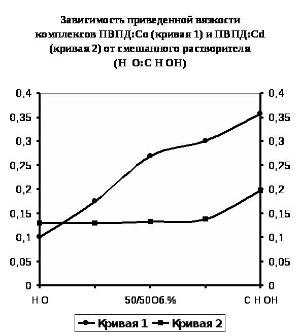 3. Изучено влияние состава растворителя на стабильность металлполимерных комплексов. Обнаружено, что комплекс ПВПД- Cd2+ почти не изменяет приведенной вязкости с увеличением объемных процентов спирта этилового С>2>Н>5>ОН, что указывает на его прочность к действию органических растворителей. С другой стороны, комплекс ПВПД-Со2+ сохраняет свои характеристики только в водной среде.