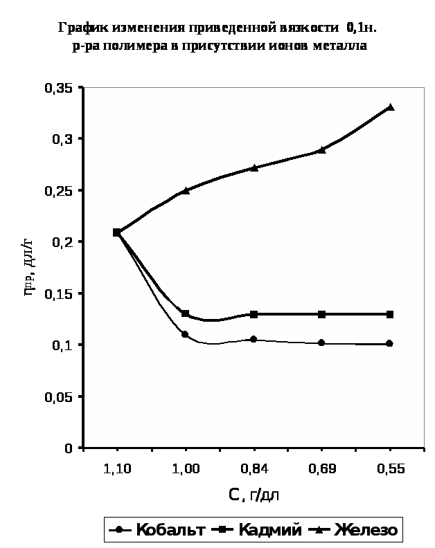 2. Изучено влияние температуры на стабильность образовавшихся комплексов. Было выяснено, что повышение температуры ведет к повышению приведенной вязкости, что свидетельствует о деструкционных процессах полимер-металлических комплексов.