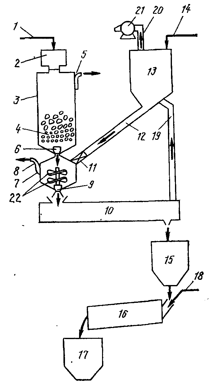 Минерал, содержащий известь, перед подачей в резервуар 7 накапливается в загрузочном бункере 13, куда он поступает по линии 14. Там его подвергают подогреву горячим воздухом, выходящим из охлаждающей камеры 10 по линии 19. Горячий воздух проходит через материал, находящийся в бункере 13 и выходит по линии 20 со всасывающим насосом 21. Нагретый минерал, содержащий известь, под действием собственной массы поступает по питательной трубе 12 к золотнику //, который регулирует скорость подачи сырья таким образом, что крыльчатки 22, находящиеся в резервуаре 7, обеспечивают полное смешивание шлака и минерала, содержащего известь.