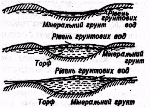 За характером водно-мінерального живлення, формою поверхні і складом рослинності торфові болота поділяються, у свою чергу, на три типи: низинні перехідні і верхові (рис. 1.2).