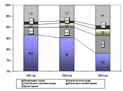 Общая для всего рассматриваемого периода с 2003 по 2005 год динамика изменения затрат на производство заключается в их тенденциальном снижении в условиях варьирующейся структуры товарной продукции.