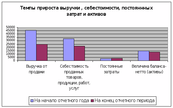 Постоянные затраты несколько возросли к концу отчетного периода . Однако себестоимость продукции уменьшилась значительнее. Рост постоянных затрат над себестоимостью на конец отчетного периода увеличивает операционный рычаг, т.е. наряду с увеличением «бизнес»-риска увеличивается вероятность повышения операционной прибыли предприятия. Однако постоянные материальные расходы должны покрываться постоянными доходами – выручкой, а ее динамика за анализируемый период неудовлетворительна.